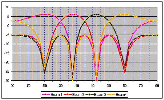 According to such intelligence, beam forming mechanism keeps forming beams or nulls. When one beam reaches its peak at certain point, all other beams are at trough. The following plot is a perfect demonstration of orthogonal beams.